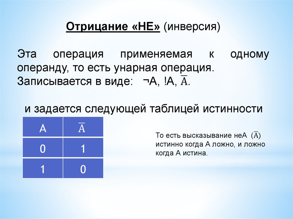 Отрицание «НЕ» (инверсия)Эта операция применяемая к