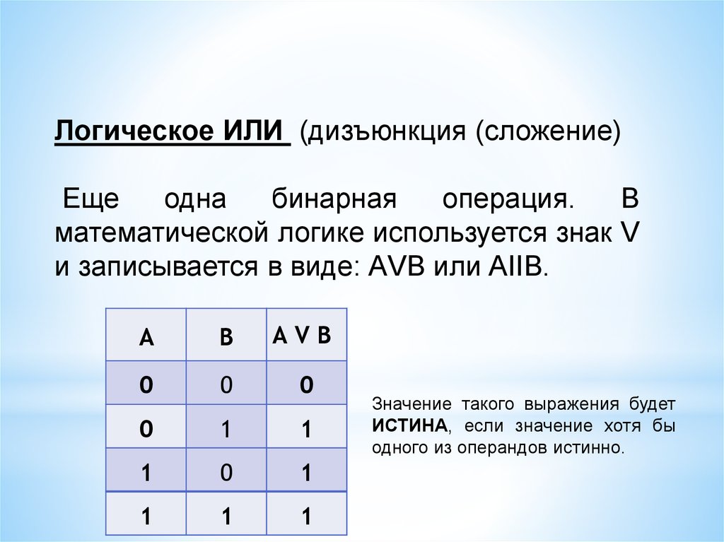 Логическое ИЛИ (дизъюнкция (сложение)Еще