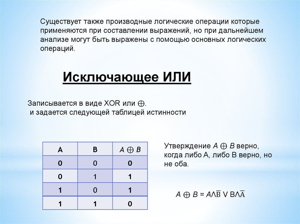 Существует также производные логические операции которыеприменяются при составлении выражений, но при дальнейшем