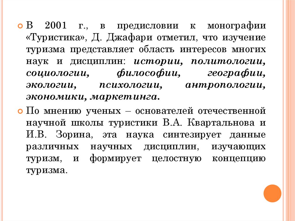 В 2001 г., в предисловии к монографии«Туристика», Д. Джафари отметил, что изучение
