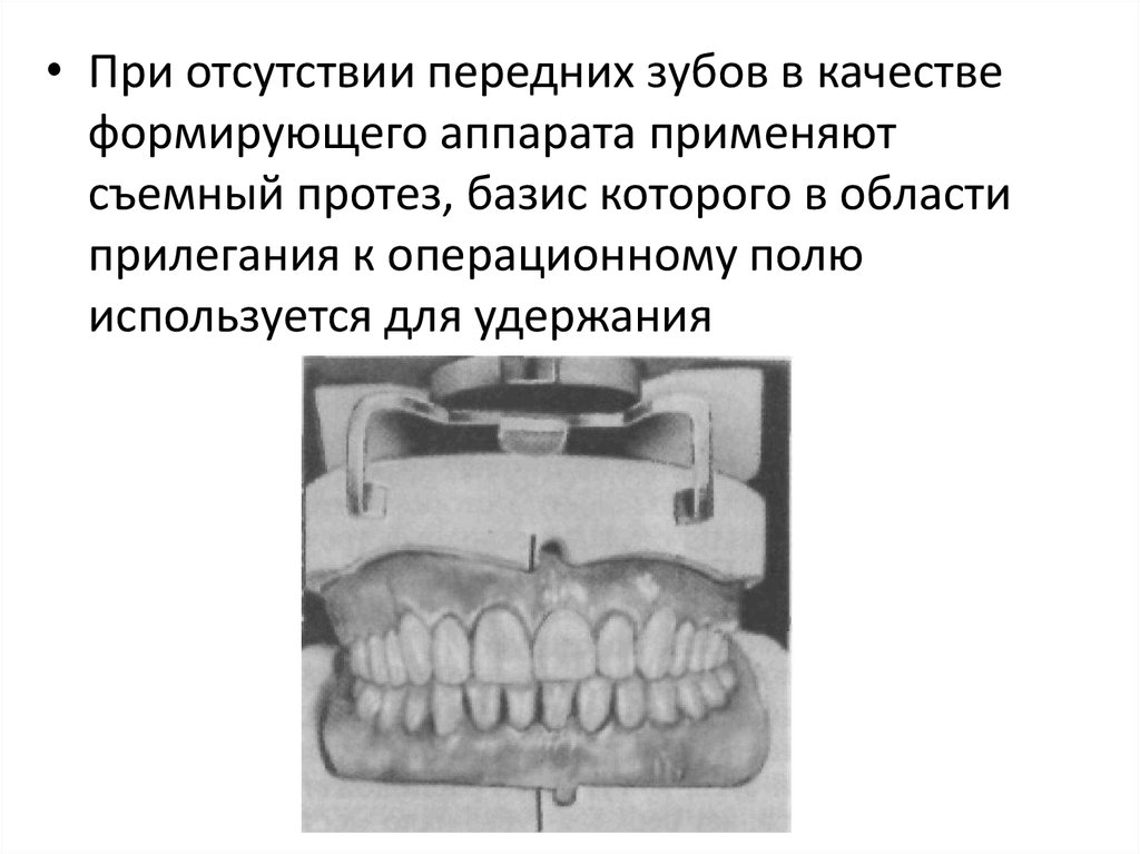 • При отсутствии передних зубов в качествеформирующего аппарата применяют