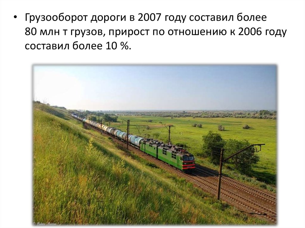 • Грузооборот дороги в 2007 году составил более80 млн т грузов, прирост по отношению к 2006 году