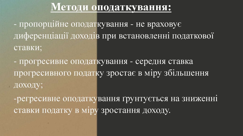 Методи оподаткування:- пропорційне оподаткування - не враховує