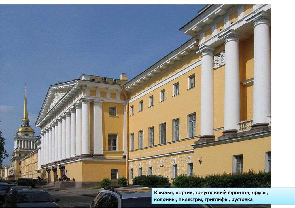 Крылья, портик, треугольный фронтон, ярусы,колонны, пилястры, триглифы, рустовка