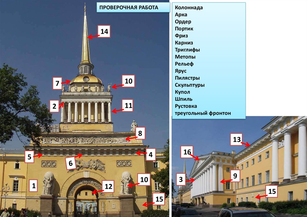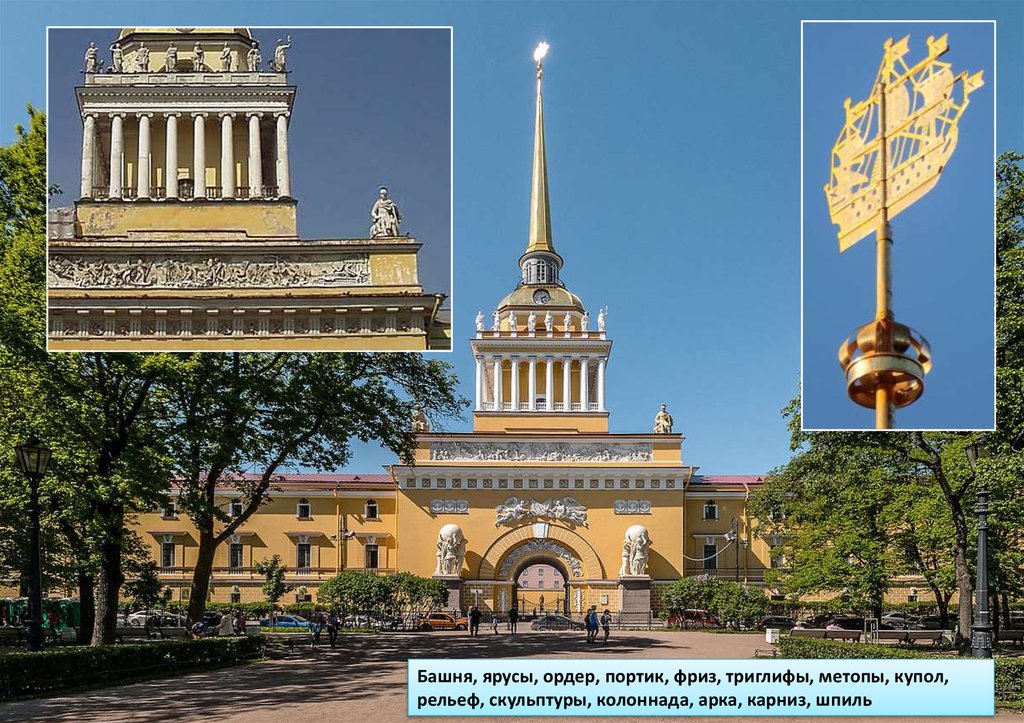 Башня, ярусы, ордер, портик, фриз, триглифы, метопы, купол,рельеф, скульптуры, колоннада, арка, карниз, шпиль