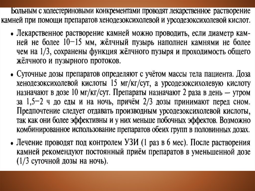 Лекарственное растворение камней (холестериновых) в настоящее времяиспользуют очень редко. Применяют хенодезоксихилевую (хенофальк,