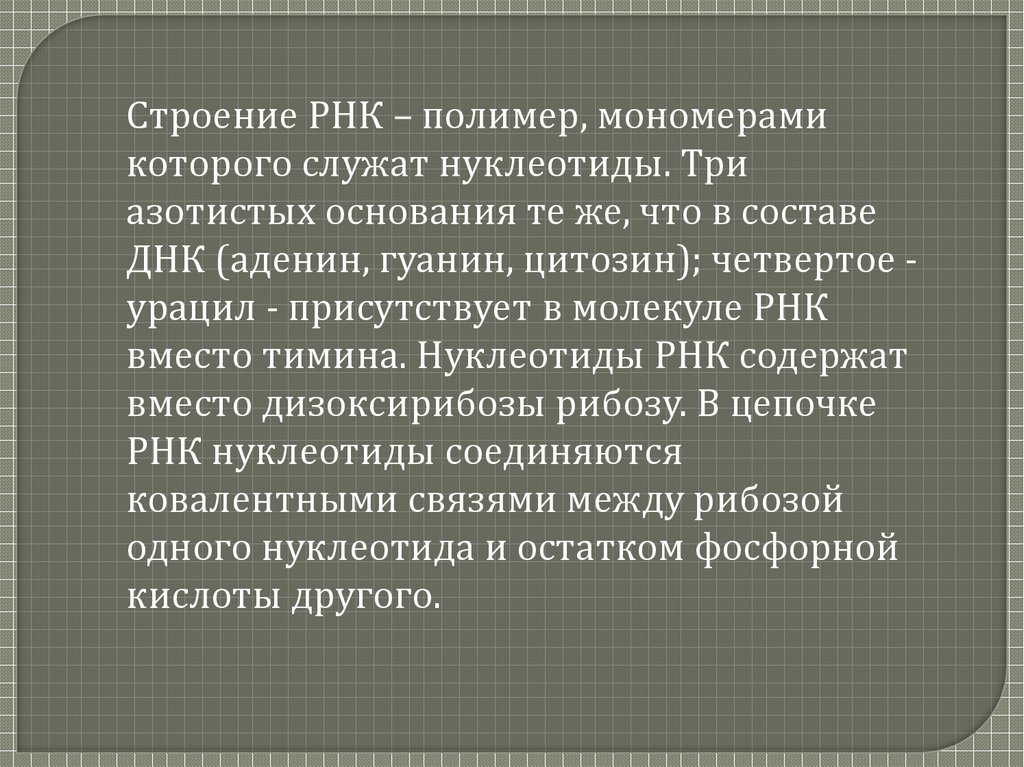 Строение РНК – полимер, мономерамикоторого служат нуклеотиды. Три