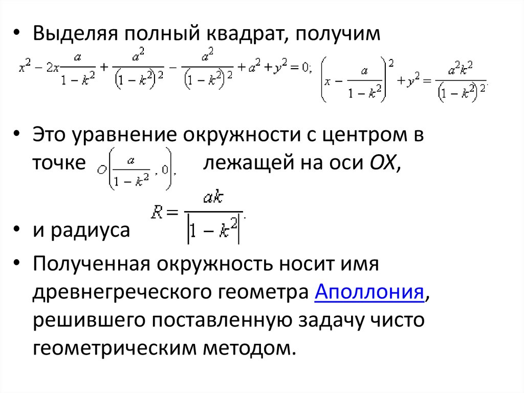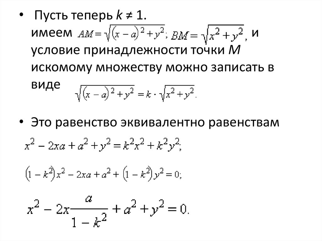 • Решая задачу в общем виде т.е. при условии ,что точкаА имеет координаты (a;0) и k≠1 получим уравнение