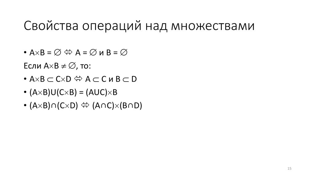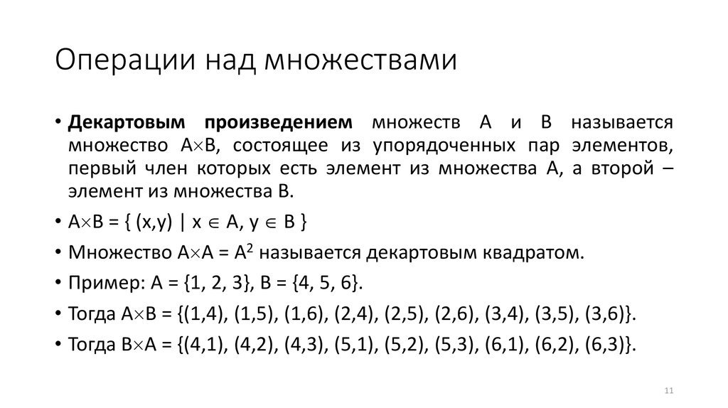 Операции над множествами• Декартовым произведением множеств A и B называется