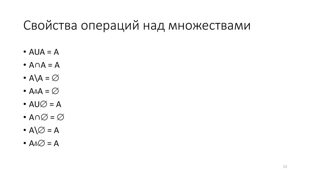 Свойства операций над множествами• AUB = BUA (коммутативность)