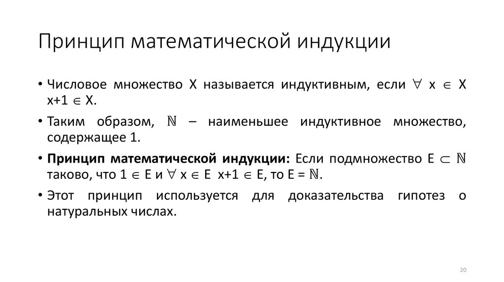 Принцип математической индукции• Числовое множество X называется индуктивным, если x X