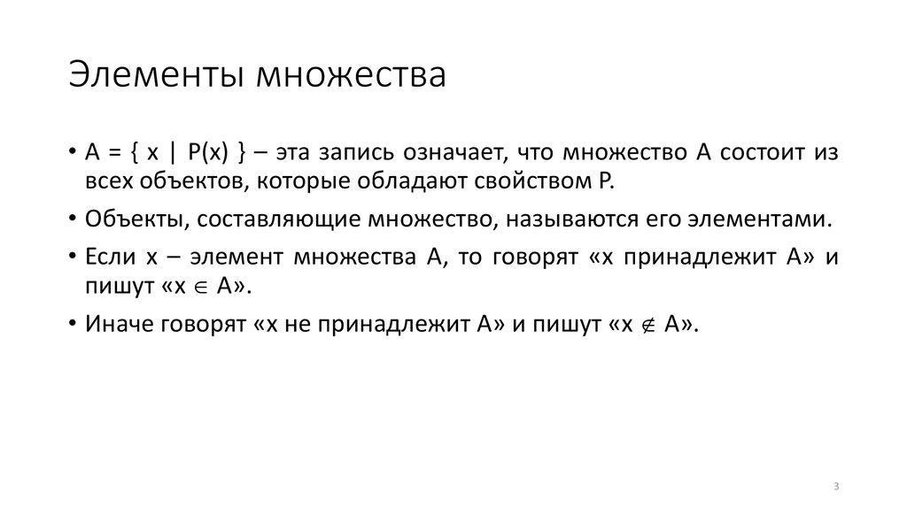 Элементы множества• A = { x | P(x) } – эта запись означает, что множество A состоит из