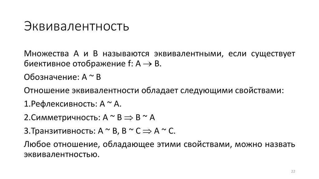 ЭквивалентностьМножества A и B называются эквивалентными, если существует