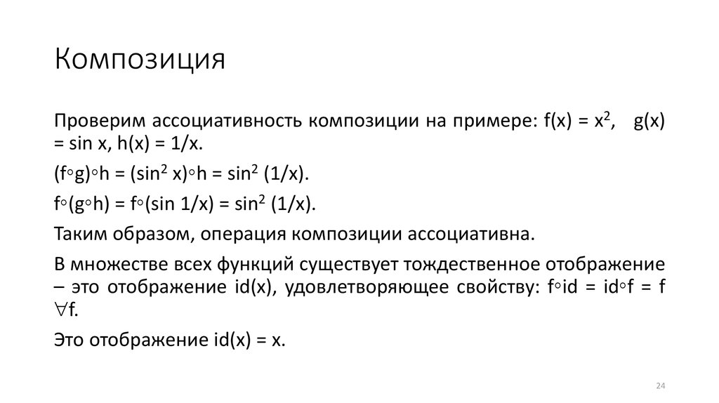 КомпозицияПроверим ассоциативность композиции на примере: f(x) = x2, g(x)