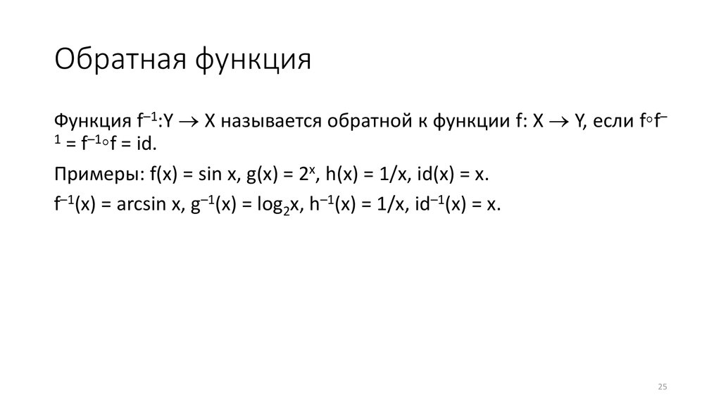 Обратная функцияФункция f–1:Y X называется обратной к функции f: X Y, если f◦f–