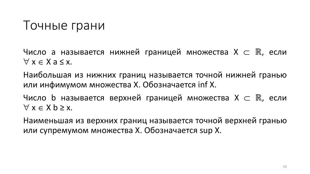 Точные граниЧисло a называется нижней границей множества X ℝ, если