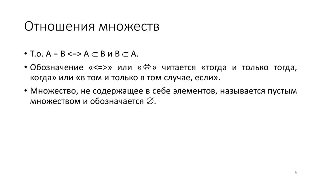 Отношения множеств• Если множества A и B состоят из одних и тех же элементов, то эти