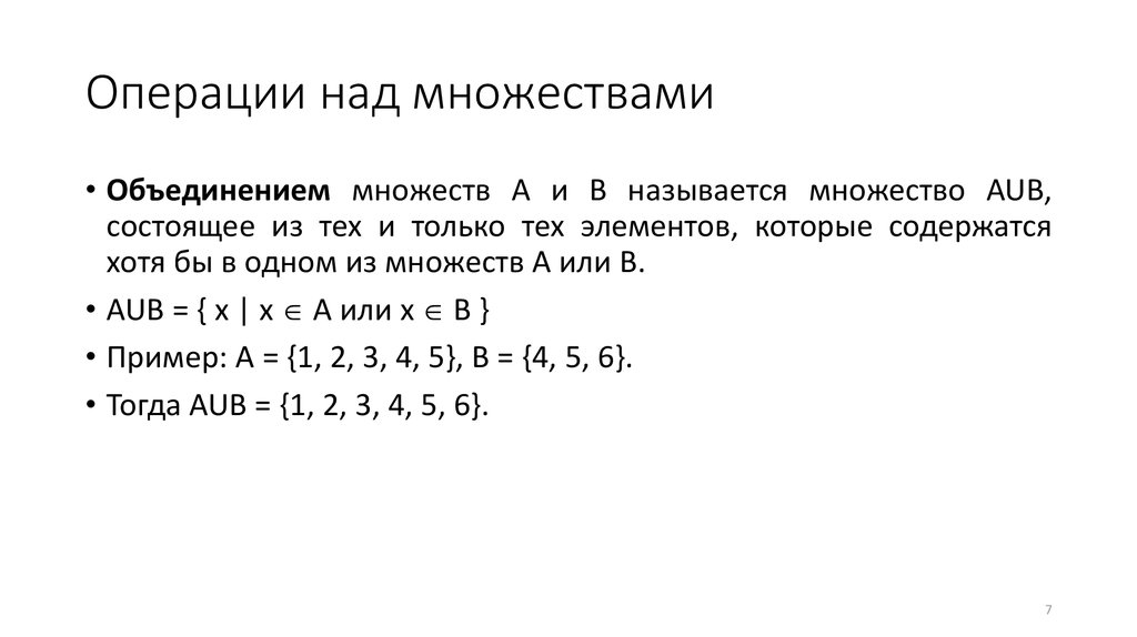 • Тогда AUB = {1, 2, 3, 4, 5, 6}.