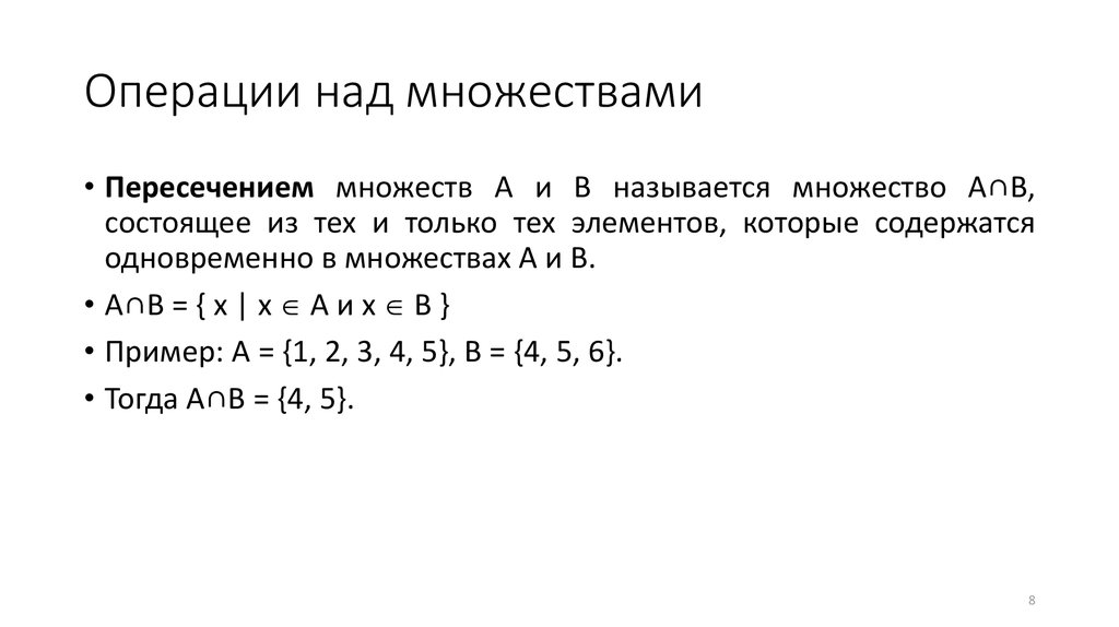 • Пример: A = {1, 2, 3, 4, 5}, B = {4, 5, 6}.