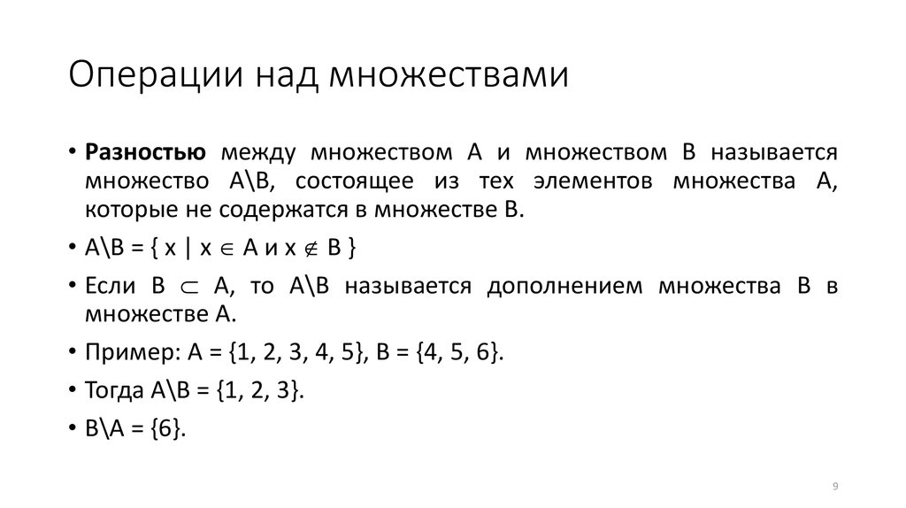 Операции над множествами• Разностью между множеством A и множеством B называется