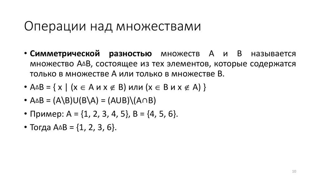 • AΔB = { x | (x A и x B) или (x B и x A) }