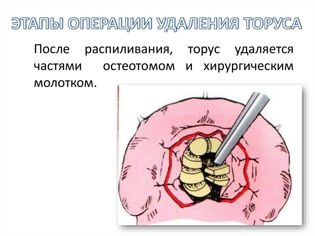 После распиливания, торус удаляетсячастями остеотомом и хирургическим