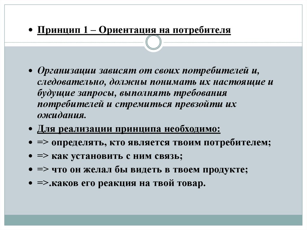 Принцип 1 – Ориентация на потребителяОрганизации зависят от своих потребителей и,