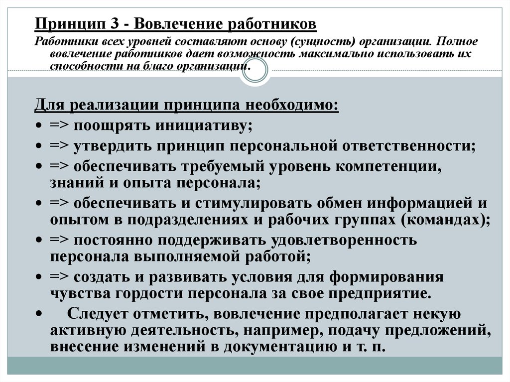 Принцип 3 - Вовлечение работниковРаботники всех уровней составляют основу (сущность) организации. Полное