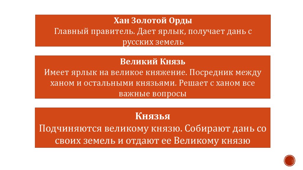 Хан Золотой ОрдыГлавный правитель. Дает ярлык, получает дань с