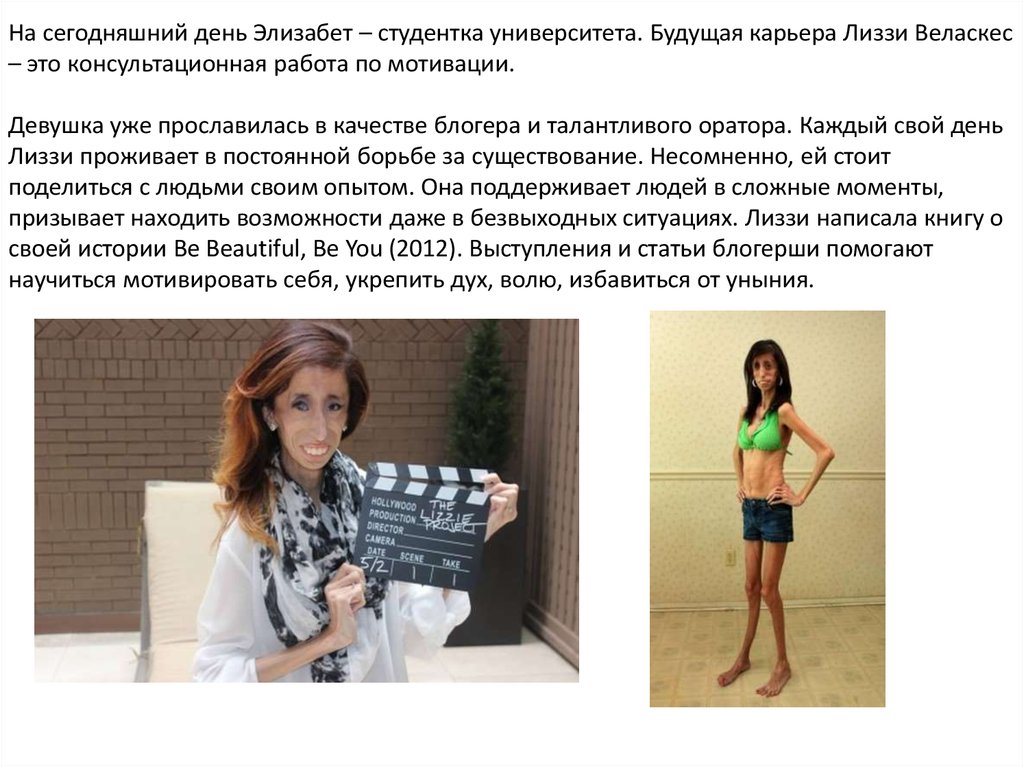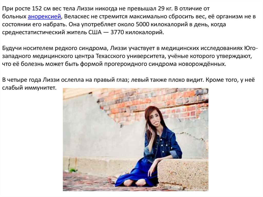 При росте 152 см вес тела Лиззи никогда не превышал 29 кг. В отличие отбольных анорексией, Веласкес не стремится максимально сбросить вес, её организм не в
