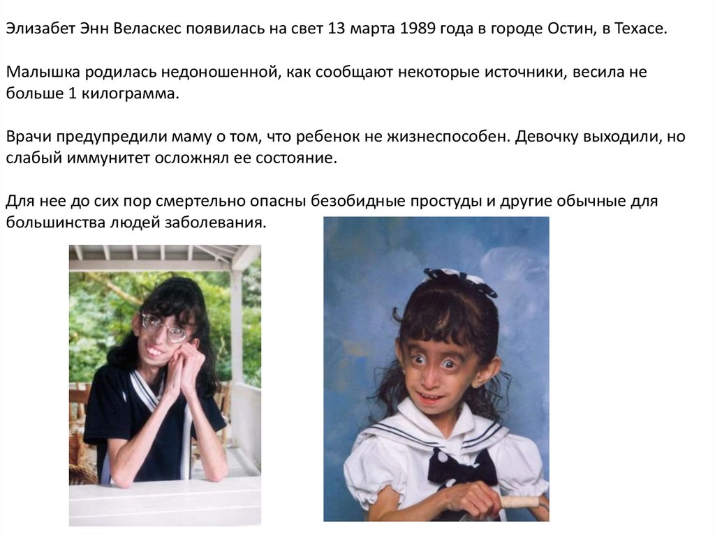 Элизабет надеется, что ученые помогут облегчить ее существование. Возможно, когданибудь она сможет устроить свою личную жизнь.Семья Лиззи Веласкес – это единственная ее опора. Девушка называет своих родителей