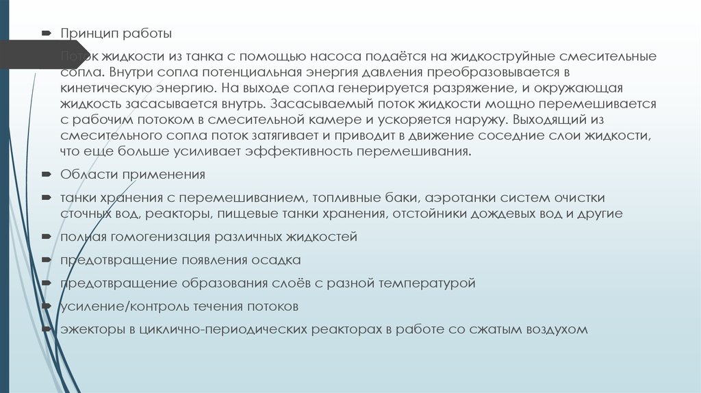 Принцип работыПоток жидкости из танка с помощью насоса подаётся на жидкоструйные смесительные