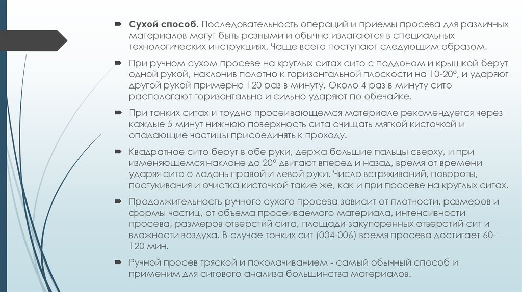 Сухой способ. Последовательность операций и приемы просева для различныхматериалов могут быть разными и обычно излагаются в специальных