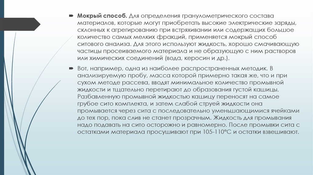 Мокрый способ. Для определения гранулометрического составаматериалов, которые могут приобретать высокие электрические заряды,