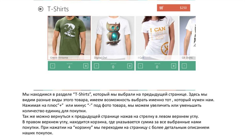 Мы находимся в разделе “T-Shirts”, который мы выбрали на предыдущей странице. Здесь мывидим разные виды этого товара, имеем возможность выбрать именно тот , который нужен нам.