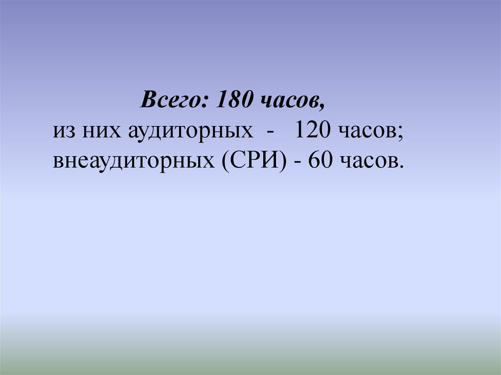 Всего: 180 часов,из них аудиторных - 120 часов;