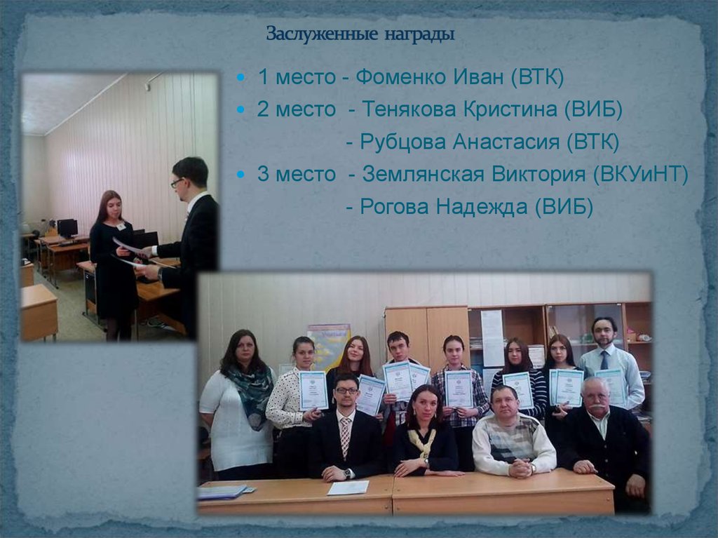 1 место - Фоменко Иван (ВТК)2 место - Тенякова Кристина (ВИБ)