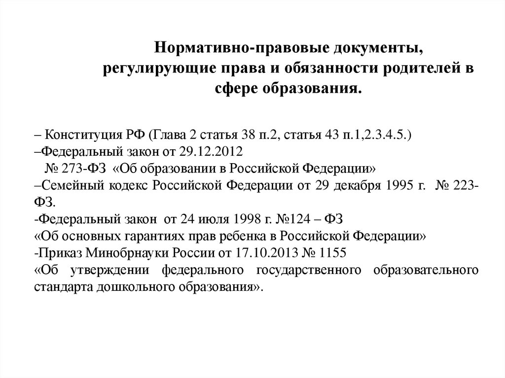 Нормативно-правовые документы,регулирующие права и обязанности родителей в