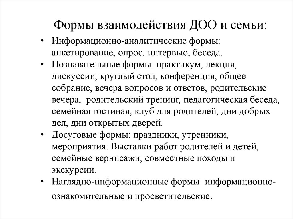 Формы взаимодействия ДОО и семьи:• Информационно-аналитические формы: