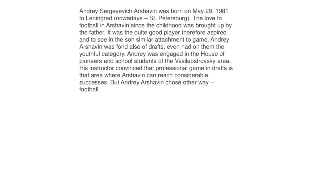 Andrey Sergeyevich Arshavin was born on May 29, 1981to Leningrad (nowadays – St. Petersburg). The love to