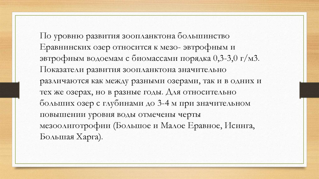 По уровню развития зоопланктона большинствоЕравнинских озер относится к мезо- эвтрофным и