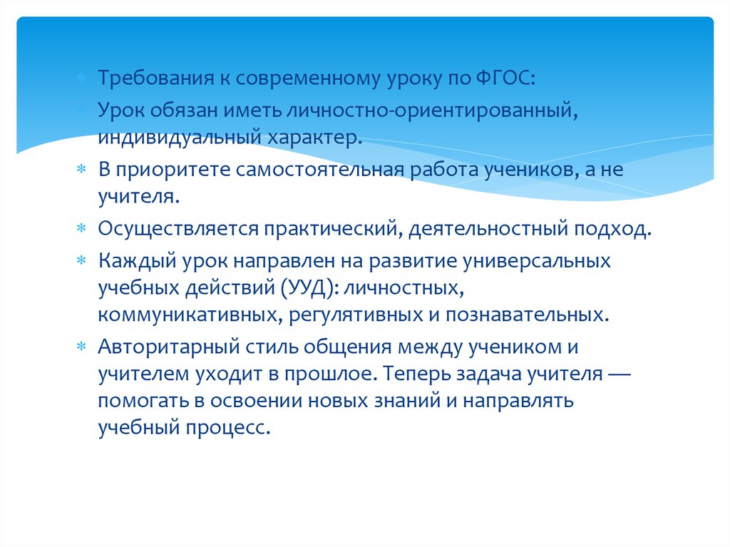 Требования к современному уроку по ФГОС:Урок обязан иметь личностно-ориентированный,