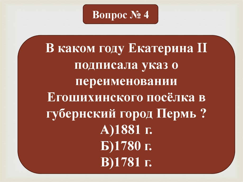 Вопрос № 4В каком году Екатерина II