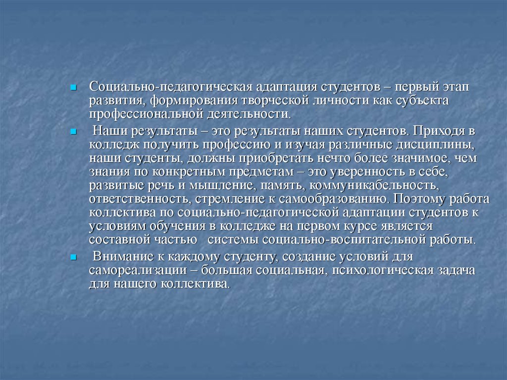 Социально-педагогическая адаптация студентов – первый этапразвития, формирования творческой личности как субъекта