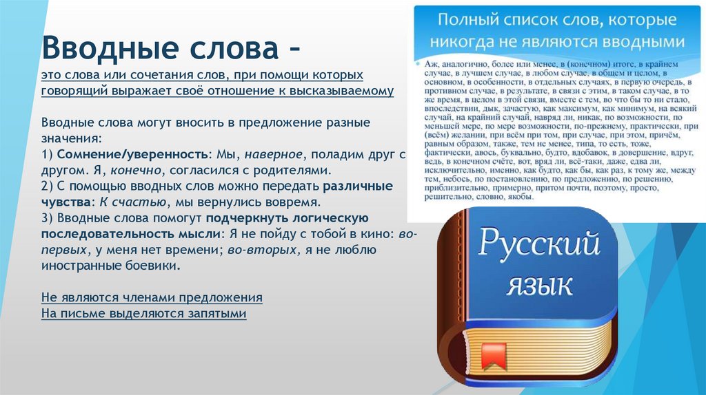 Вводные слова –это слова или сочетания слов, при помощи которых
