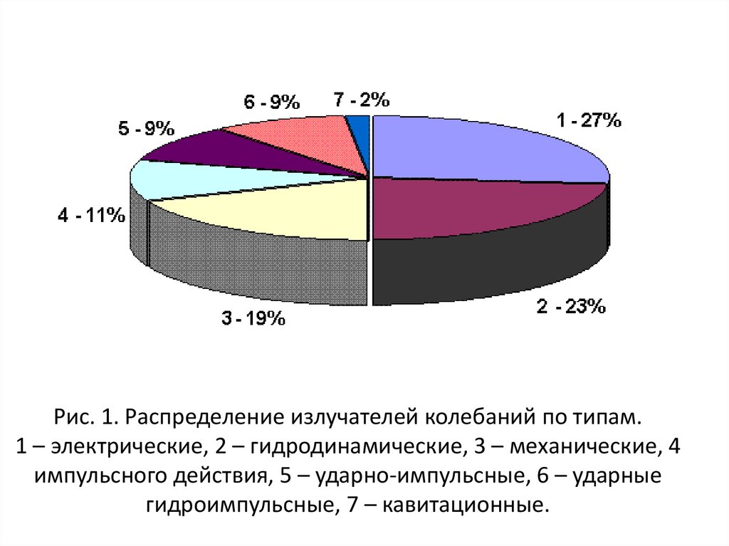 Рис. 1. Распределение излучателей колебаний по типам.1 – электрические, 2 – гидродинамические, 3 – механические, 4