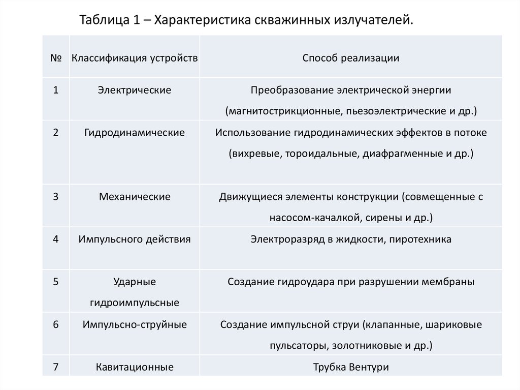 Таблица 1 – Характеристика скважинных излучателей.№ Классификация устройств