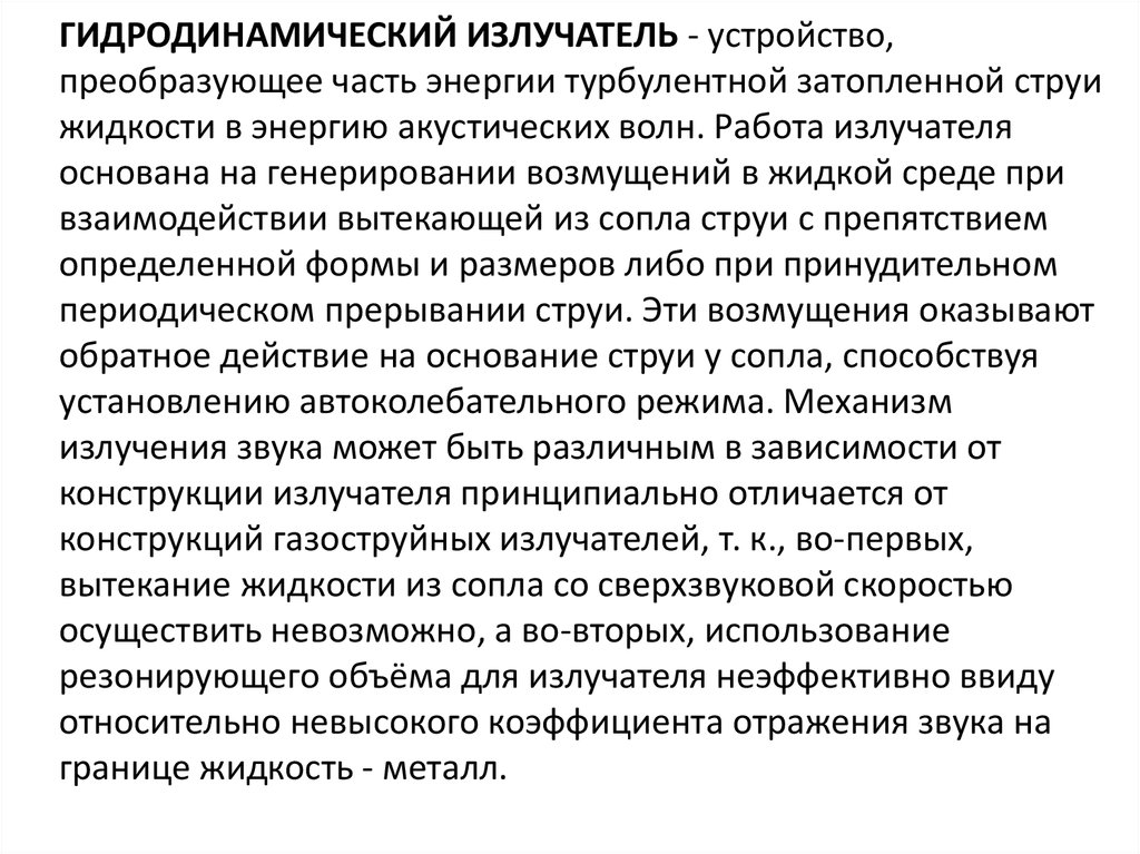ГИДРОДИНАМИЧЕСКИЙ ИЗЛУЧАТЕЛЬ - устройство,преобразующее часть энергии турбулентной затопленной струи