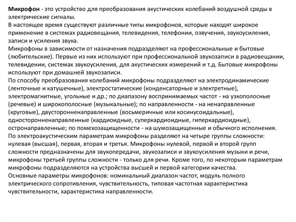 Микрофон - это устройство для преобразования акустических колебаний воздушной среды вэлектрические сигналы.