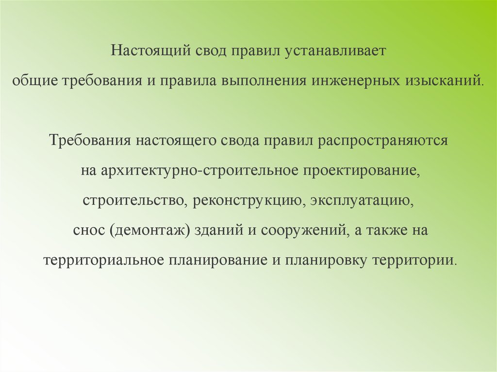 Настоящий свод правил устанавливаетобщие требования и правила выполнения инженерных изысканий.